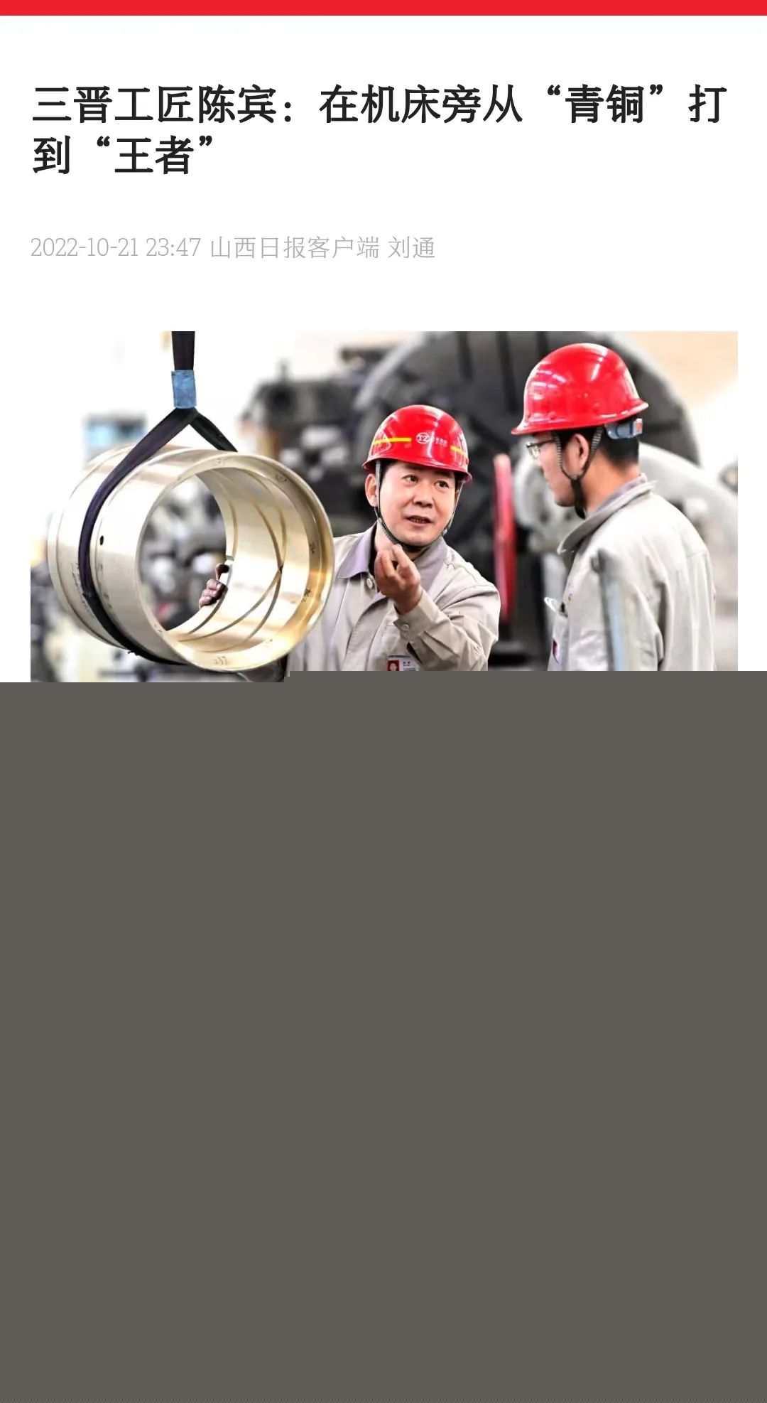 10月21日,山西日報以《三晉工匠陳賓:在機床旁從“青銅”打到“王者”》為題,對太重職工陳賓進行了報道。陳賓36年來潛心鉆研、不斷創(chuàng)新、精益求精,致力于大型關(guān)鍵零件的精加工任務(wù),成為一名名副其實的“三晉工匠”。