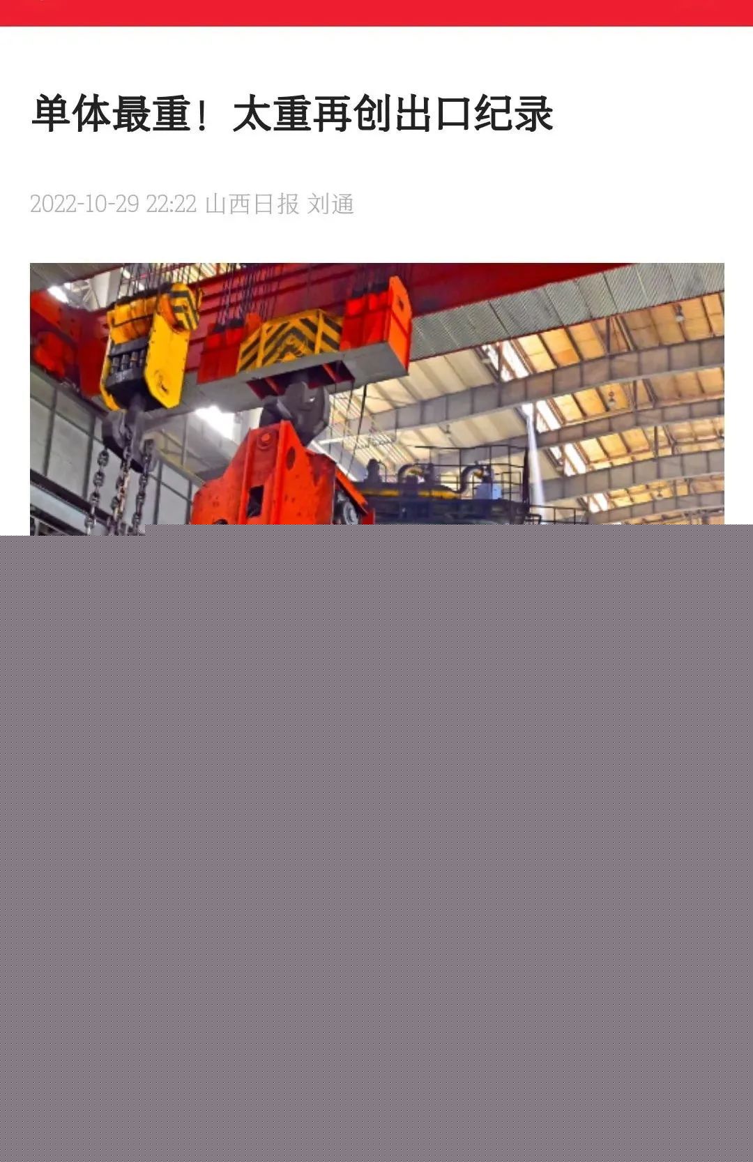 近日,山西日報以《單體最重!太重再創(chuàng)出口紀錄》為題,對太重集團高端裝備制造領域的新突破進行報道。太重集團堅持以“精細化、國際化、高端化、智能化”為方向,以智能制造、科技創(chuàng)新為動能,在轉型升級中展現(xiàn)新作為,積極履行好高端裝備制造產業(yè)鏈“鏈主”企業(yè)責任,持續(xù)加大關鍵核心技術攻關力度,為公司建設具有國際一流競爭力的現(xiàn)代智能裝備制造企業(yè)蓄勢賦能。