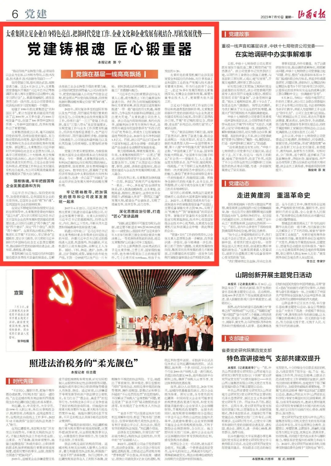 今天,山西日報刊發(fā)《黨建鑄根魂 匠心鍛重器》文章,聚焦太重集團(tuán)以習(xí)近平新時代中國特色社會主義思想為指引,認(rèn)真學(xué)習(xí)貫徹黨的二十大精神,充分發(fā)揮黨組織政治核心、政治引領(lǐng)作用,扛起建設(shè)先進(jìn)文化的責(zé)任,立足企業(yè)自身特色和亮點,把新時代黨建工作和企業(yè)文化建設(shè)有機(jī)結(jié)合起來,實現(xiàn)高質(zhì)量高速度發(fā)展,向著建設(shè)具有國際一流競爭力的現(xiàn)代智能裝備制造企業(yè)目標(biāo)闊步邁進(jìn)。