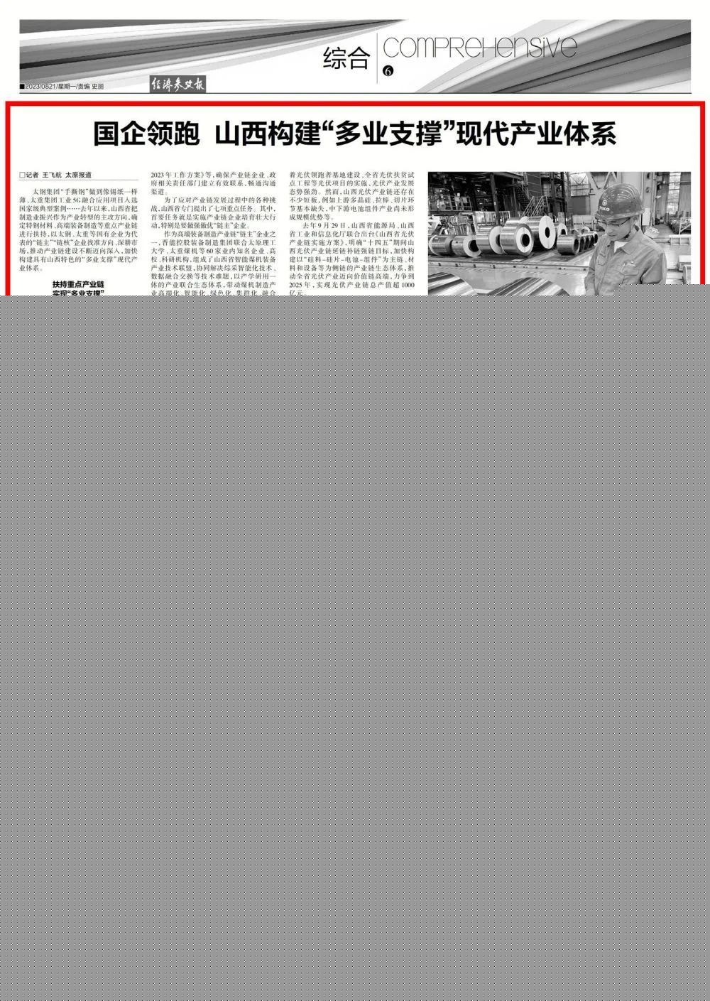 8月21日,新華社主管主辦的《經(jīng)濟(jì)參考報(bào)》刊發(fā)《國(guó)企領(lǐng)跑 山西構(gòu)建“多業(yè)支撐”現(xiàn)代產(chǎn)業(yè)體系》文章,深入報(bào)道太重轉(zhuǎn)型發(fā)展。太重集團(tuán)作為我省唯一的“雙鏈主”企業(yè),不斷提升公司在完善產(chǎn)業(yè)鏈、優(yōu)化供應(yīng)鏈、提升價(jià)值鏈中的引領(lǐng)作用,推動(dòng)鏈上企業(yè)高質(zhì)量發(fā)展。同時(shí),公司高度重視科技創(chuàng)新工作,以全國(guó)重點(diǎn)實(shí)驗(yàn)室為依托,在突破關(guān)鍵核心技術(shù)、促進(jìn)產(chǎn)業(yè)轉(zhuǎn)型升級(jí)的最前沿取得顯著成績(jī),為加快構(gòu)建具有山西特色的“多業(yè)支撐”現(xiàn)代產(chǎn)業(yè)體系貢獻(xiàn)太重力量。