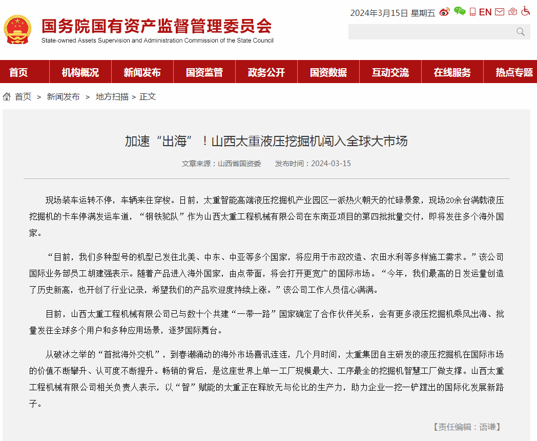作為裝備制造業(yè)的領軍企業(yè),太重被格外關注,被寄予厚望。近日,國務院國有資產監(jiān)督管理委員會官網刊登了《加速“出海”!山西太重液壓挖掘機闖入全球大市場》;山西新聞聯(lián)播也在《推動高質量發(fā)展 深化全方位轉型》欄目中對太重進行深入報道。