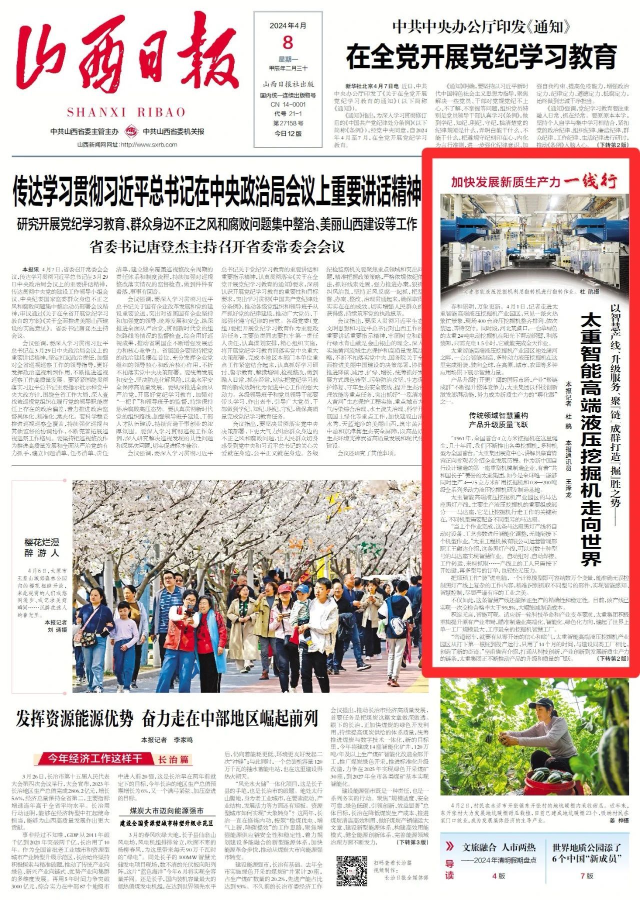 近日,《山西日報》頭版重點關(guān)注太重智能高端液壓挖掘機產(chǎn)業(yè)園區(qū),對太重液壓挖掘機給予高度評價。由智慧產(chǎn)線再到工序最全的智慧工廠,“智慧太重”正在拔地而起,向著高端化、智能化、綠色化穩(wěn)步前進。作為“鏈主”企業(yè)和山西省高端裝備制造(工程機械)產(chǎn)業(yè)聯(lián)盟理事長單位,太重集團不斷推出全球首款、全球首創(chuàng)的新能源動力裝備,填補了行業(yè)空白,推動科技成果加快轉(zhuǎn)化為現(xiàn)實生產(chǎn)力,使太重質(zhì)量享譽全球,走向國際化多維度發(fā)展。